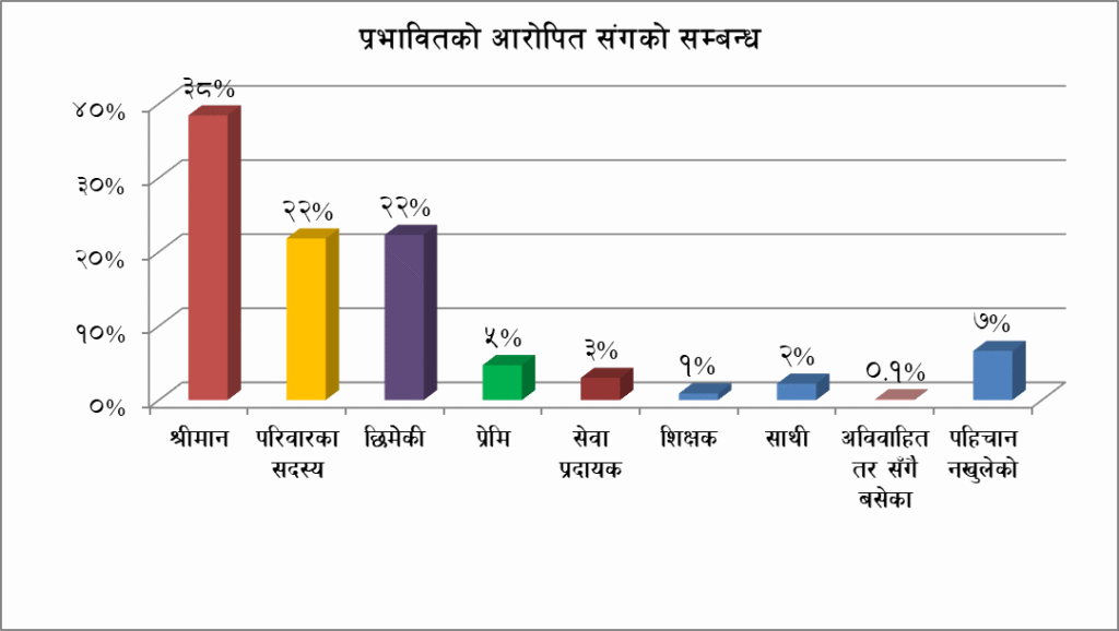 प्रभावित र आरोपितको सम्बन्धलाई बिश्लेषण गर्दा, सबैभन्दा बढी ६४३ वटा (३८ प्रतिशत) हिंसा श्रीमानबाट भएको छ भने ३७३ (२२ प्रतिशत) हिंसाको घटना छिमेकीबाट भएको छ र ३६५ वटा (२२ प्रतिशत) हिंसाको घटना परिवारका सदस्यवाट भएको छ । त्यसै गरी ४८ वटा (३ प्रतिशत) सेवा प्रदायकबाट, १११ वटा (७ प्रतिशत) अपरिचित व्यक्तिबाट, ७९ वटा (५ प्रतिशत) हिंसा प्रेमिबाट, त्यस्तै ३७ वटा (२ प्रतिशत) साथीबाट र १५ वटा (१ प्रतिशत) शिक्षकबाट हिंसा भएको पाईएको छ ।