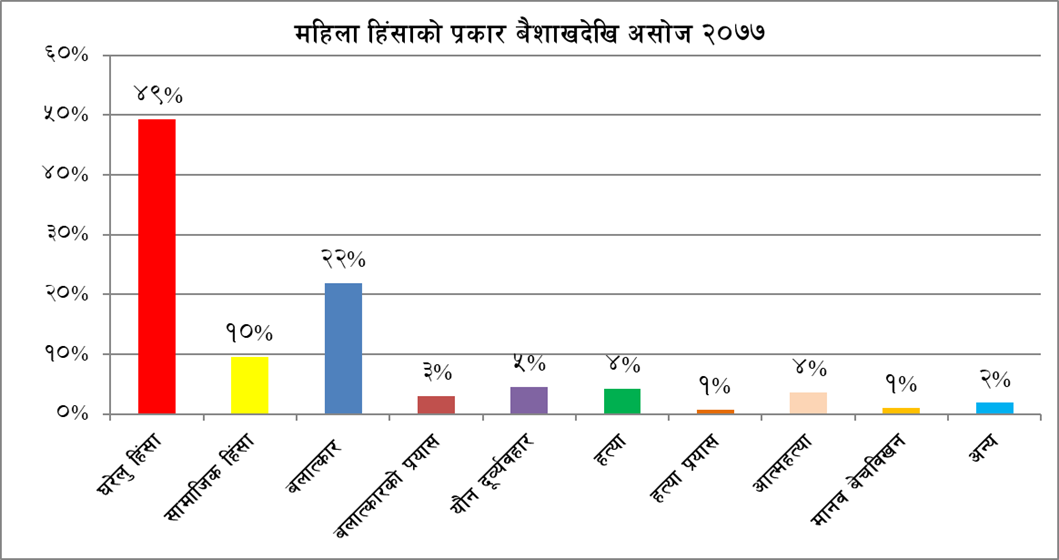 यसैक्रममा बैसाख देखि असोज २०७७ सम्मको ६ महिनाको अवधीमा जम्मा १६७३ वटा महिला तथा बालिकामाथि भएको लैङ्गिक विभेदमा आधारित हिंसाका घटना ओरेकमा अभिलेखिकरण भएको छ जसमध्ये ९० प्रतिशत घटना प्रभावितको समुदाय र परिवारमै घटेको पाइएको छ । साथै असोज महिनामा मात्र ओरेकले कार्यालयमा अभिलेखिकरण गरेका (१३८) तथा विभिन्न राष्ट्रिय पत्रपत्रिकाहरुबाट प्राप्त (५०) तथ्याङ्कका आधारमा १८८ वटा लैङ्गिक विभेदमा आधारित हिंसाको तथ्याङ्क संकलन गरेको छ ।