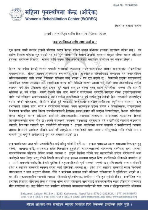 द्वन्द्व प्रभावितहरु आज पनि घरवारविहीन भई बाँच्नु परेको स्थिती छ । द्वन्द्वका प्रभावका कारण समाजमा तिरस्कृत हुनु परेको, लान्छना खप्दै, समाजबाट समेत विस्थापित हुनुपरेको, बालबच्चाहरुको भविश्यको अन्यौलता तथा चिन्ता, बालबालिकाहरु पहिचान बिहिन भएको अवस्था र द्वन्द्वले सिर्जना गरेको यस महामारीको जटिल परिस्थितले अझ चर्काएको घाउ लिएर बस्नु परेको स्थिती आजको द्धन्द्ध द्वन्द्वका समयमा भएका हिंसा प्रभावितको जीवनको यथार्थता हो । लामो समयको पर्खाइपछि देशले दुईतिहाई बहुमतसहितको पूर्ण सरकार पाएको छ । संघियताको अभ्यास सँगसगै प्रदेश र स्थानिय सरकारले स्वतन्त्र रुपमा कार्य गरिरहेको अवस्था छ । प्रदेश तथा स्थानिय सरकारले स्थान विशेषको आवश्यकता र माग अनुसार योजना, नीति र कार्यक्रम बनाउन सक्ने अधिकार संविधानमा नै सुनिश्चित भएको छ । तर पनि संक्रमणकालीन न्यायको व्याख्या महिलाको दृष्टिकोणबाट अझैसम्म पनि हुन सकेको छैन । द्वन्द्वपीडित तथा प्रभावित विशेषतः यौनजन्य हिंसा र यातना भोग्न बाध्य महिलाको आवाजलाई संक्रमणकालीन न्याय प्रक्रियामा राज्यबाट मौन गराईएको छ । द्वन्द्व पीडित तथा प्रभावित महिलाको आत्मसम्मानसहितको सत्य, न्याय र परिपूरणकालागि अविलम्ब व्यवस्था गर्न साथै संक्रमणकालीन न्यायलाई कानुनी ब्याख्याको परिधीबाट फराकिलो पारी स्वन्याय, पारीवारिक न्याय र सामाजिक न्यायको अनुभूति गर्ने संयन्त्र र वातावरण निर्माण गर्न माग गर्दै आज अन्तर्राष्ट्रिय शान्ति दिवसका अवसरमा द्वन्द्व प्रभावितहरुको मानव अधिकारको सम्मान, संरक्षण र परिपुरणका लागि सरकारसँग अपिल गर्दछौं ।