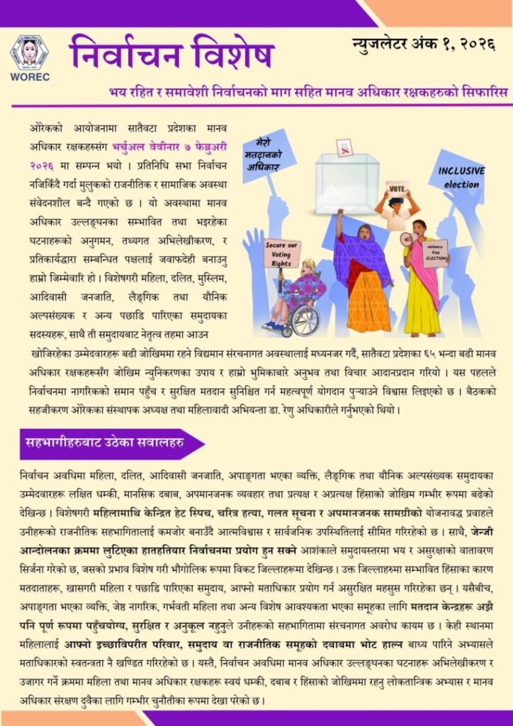 प्रतिनिधि सभा निर्वाचन नजिकिँदै गर्दा मुलुकको राजनीतिक तथा सामाजिक अवस्था संवेदनशील बन्दै गएको सन्दर्भमा ओरेकको आयोजनामा सातै प्रदेशका ६५ भन्दा बढी मानव अधिकार रक्षकहरूको सहभागितामा भर्चुअल वेवीनार सम्पन्न भयो। कार्यक्रममा निर्वाचन अवधिमा महिला, दलित, आदिवासी जनजाति, अपाङ्गता भएका व्यक्ति, लैङ्गिक तथा यौनिक अल्पसंख्यक समुदायका उम्मेदवार तथा मतदातामाथि हुन सक्ने धम्की, हेट स्पिच, गलत सूचना, दबाब तथा हिंसाको जोखिमबारे गहन छलफल गरिएको थियो। साथै, सुरक्षित र प्रमाणमा आधारित अभिलेखीकरण, जोखिमयुक्त क्षेत्रका लागि विशेष सुरक्षा योजना, पहुँचयोग्य र अनुकूल मतदान केन्द्र, डिजिटल हेट स्पिच अनुगमन प्रणाली तथा मानव अधिकार रक्षकहरूको सुरक्षा र कानुनी संरक्षण सुनिश्चित गर्नुपर्ने विषयमा मुख्य सिफारिसहरू प्रस्तुत गरिएका छन्। लोकतान्त्रिक मूल्य, समान सहभागिता र भय रहित मतदान वातावरण सुनिश्चित गर्न सबै सरोकारवालाबीच समन्वय र सहकार्य आवश्यक रहेकोमा जोड दिइएको छ।.