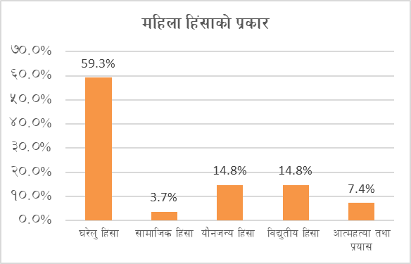 यस अक्टोबरदेखि डिसेम्बर, २०२५ सम्मको अवधिमा सुदूरपश्चिम प्रदेशको जिल्लाहरुबाट लैङ्गिक विभेदमा आधारित हिंसाका कुल २७ वटा घटनाहरू अभिलेखीकरण गरिएको छ । जसमा विद्युतीय माध्यमबाट भएको हिंसा ४ वटा (१४.८ प्रतिशत), यौन हिंसा ४ वटा (१४.८ प्रतिशत), घरेलु हिंसाको १६ वटा (५९.३ प्रतिशत) घटना र आत्महत्या प्रयासको २ वटा (७.४ प्रतिशत) घटना रहेका छन् ।