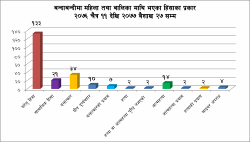 बैशाख ३०, काठमाडाै, बन्दाबन्दीको समयमा१ २४ वटा जिल्लाहरुमा२ २३१ जना महिला तथा बालिकामाथि विभिन्न प्रकारको हिंसा भएको पाईएको छ । यस हप्तामा मात्र ५५ वटा महिला तथा बालिकामाथि भएको हिंसाका घटना अभिलेखिकरण भएको छ ।