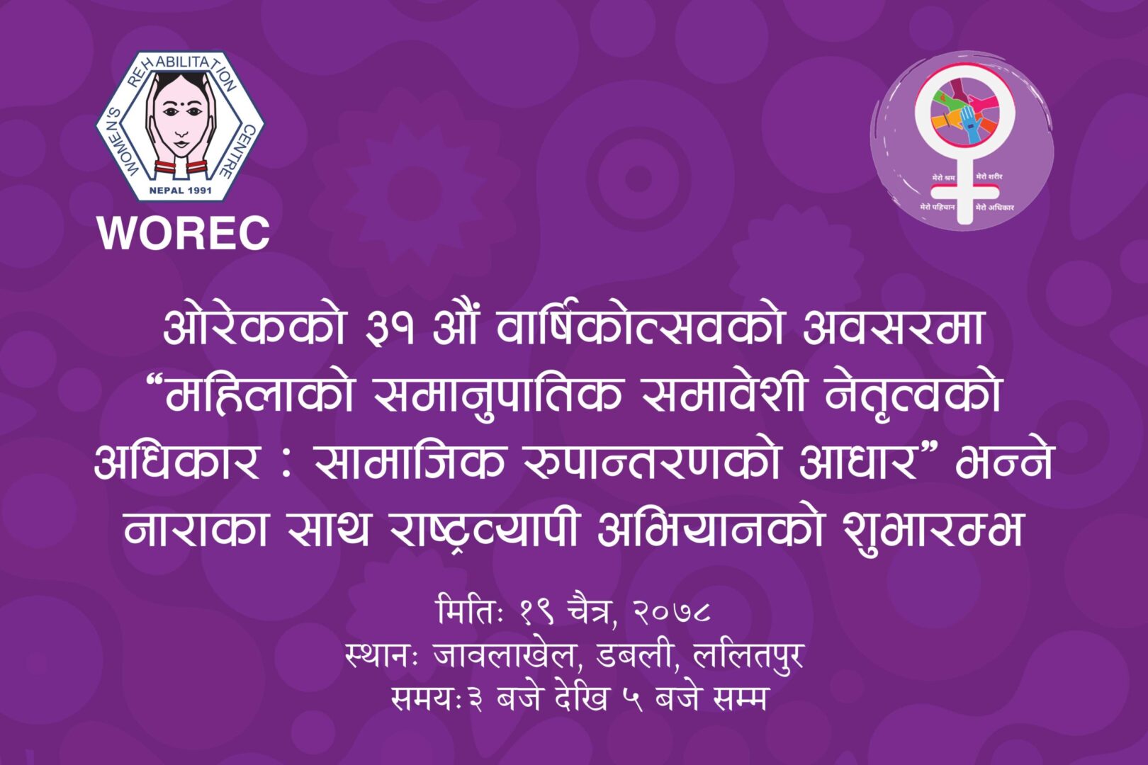 महिला पुर्नस्थापना केन्द्र (ओरेक) ले आफ्नो ३१औं वार्षिकोत्सवको शुभ–अवसरमा आगामी निर्वाचनमा निर्णायक तहमा महिलाको अर्थपूर्ण समानुपातिक समावेशी सहभागिता सुनिश्चितताको वातावरण तयार गर्न “महिलाको समानुपातिक समावेशी नेतृत्वको अधिकार : सामाजिक रुपान्तरणको आधार” भन्ने नारा सहित राष्ट्रव्यापी अभियान मिति २०७८ साल चैत्र १९ गते घोषणा गर्दैछ ।