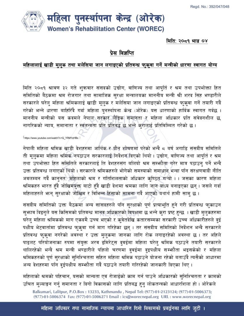 मिति २०८१ श्रावण ३२ गते शुक्रवार संसदको उद्योग, वाणिज्य तथा आपुर्ति र श्रम तथा उपभोक्ता हित समितिको बैठकमा श्रम रोजगार तथा सामाजिक सुरक्षा मन्त्रालयका माननीय मन्त्री श्री शरद सिंह भण्डारीले सरकारले घरेलु महिला श्रमिकलाई खाडी मूलुक र मलेसिया जान लगाइएको प्रतिवन्ध फुकुवा गर्ने तयारी गर्दै गरेको भन्ने धारणा बाहिरिँदै गर्दा महिला पुनस्र्थापना केन्द्र (ओरेक) यस धारणाको हार्दिक स्वागत गर्दछ । साथै, महिला श्रमिकहरु शोषण र दुव्र्यवहारबाट मुक्त भई काम गर्न सक्ने अवसरको सिर्जना गर्न यसको प्रभावकारी कार्यान्वयनका लागि ओरेक अनुरोध गर्दछ । यसको आधारमा अन्य मुलुकमा लगाइएको प्रतिवन्ध पनि छिट्टै हटाउन उचित पहल कदमी चाल्न हामी सरकारसँग अपील गर्दछौँ ।