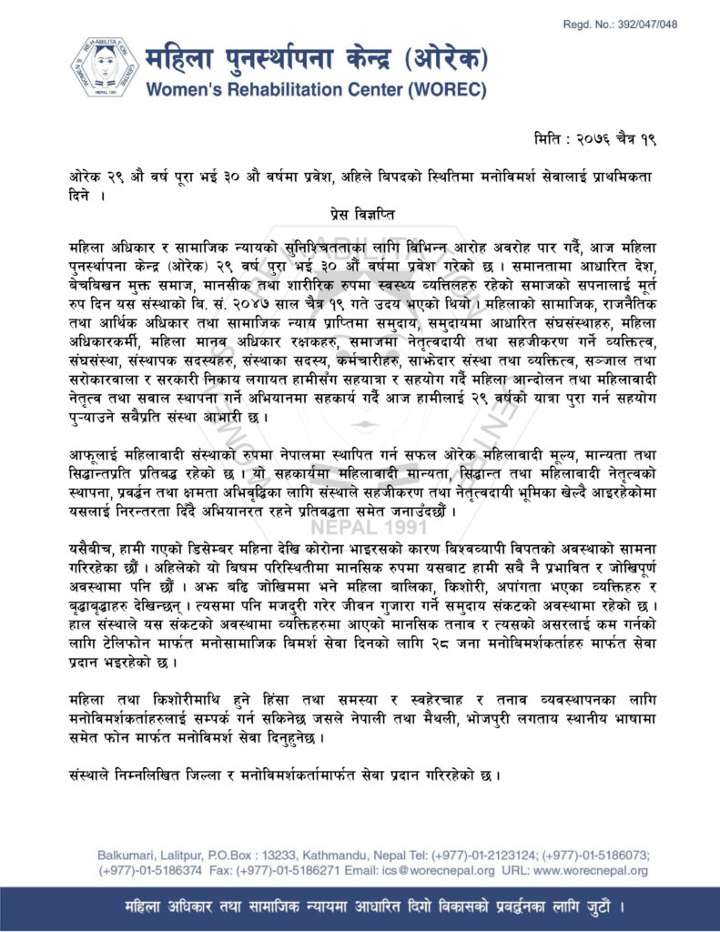 मिति ः २०७७ बैशाख २२ बन्दाबन्दीको समयमा१ १८ वटा जिल्लाहरुमा२ १७६ जना महिला तथा बालिकामाथि विभिन्न प्रकारको हिंसा भएको पाईएको छ । महिला पुनस्र्थापना केन्द्र (ओरेक) द्वारा सञ्चालन गरिएको ३ वटा हटलाईन, मनोविमर्शकर्ता, महिला मानव अधिकार रक्षक, साझेदार महिला सामुदायीक संघसंसस्थाहरुबाट, यी घटनाहरु अभिलेखिकरण गरिएको छ । यी मध्ये ९ वटा घटनाहरु सञ्चार माध्यमबाट संकलन […]