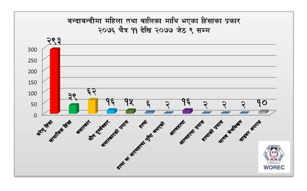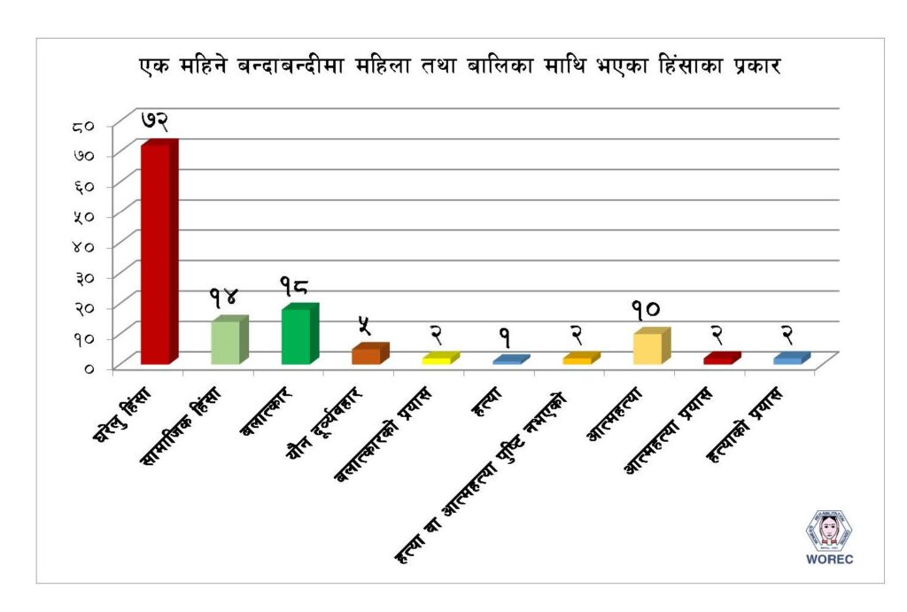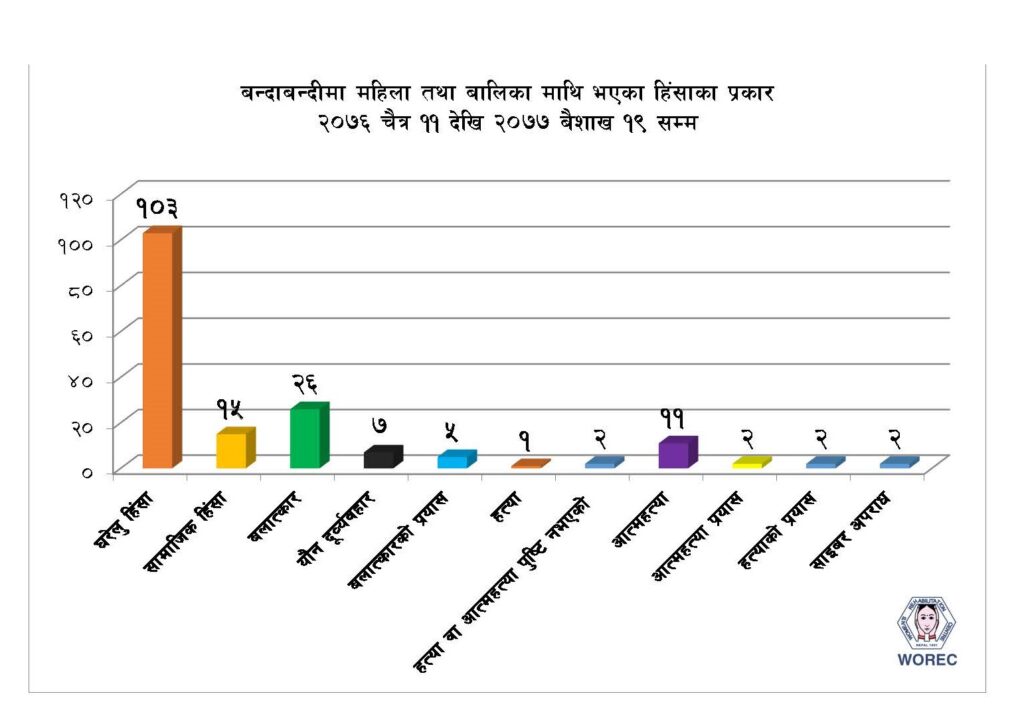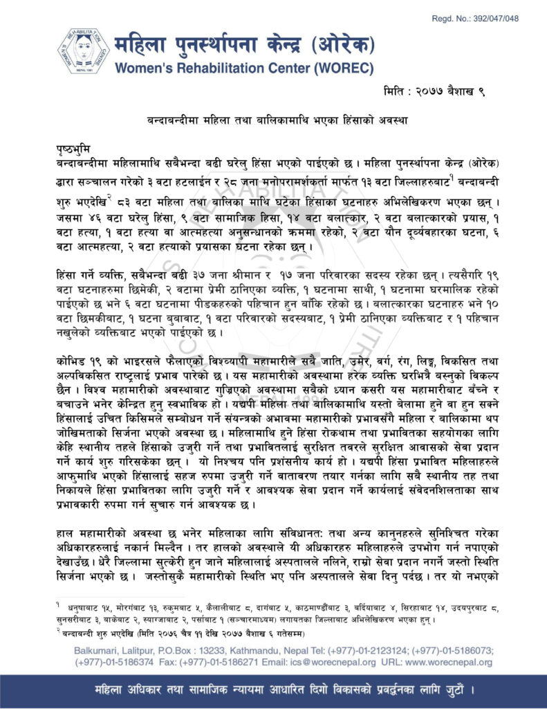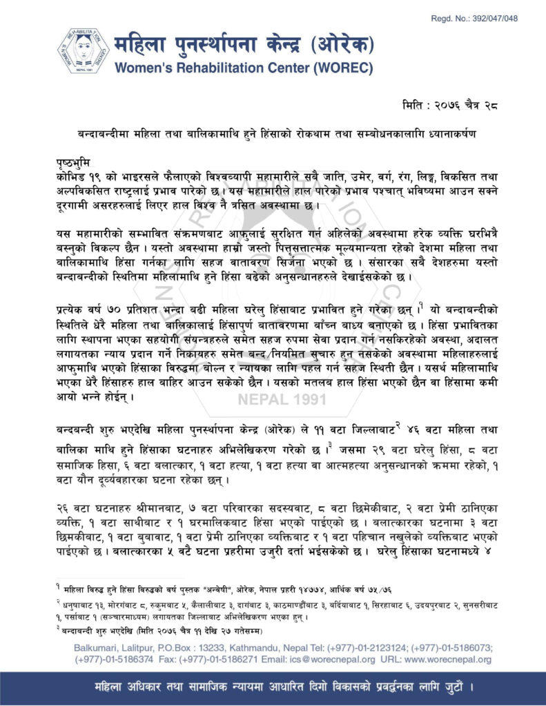 पृष्ठभुमि चैत्र ११ देखि बैशाख ११ सम्मको समयमा १२८ जना महिला तथा बालिकामाथि विभिन्न प्रकारको हिंसा भएको पाईएको छ । महिला पुनस्र्थापना केन्द्र (ओरेक) द्धारा सञ्चालन गरिएको ३ वटा हटलाईन र २८ जना मनोपरामर्शकर्ता मार्फत १५ वटा जिल्लाहरुबाट बन्दाबन्दी शुरु भएदेखि १२८ जना महिला तथा बालिका माथि घटेका हिंसाका घटनाहरु अभिलेखिकरण भएका छन् । जसमा ७२ […]