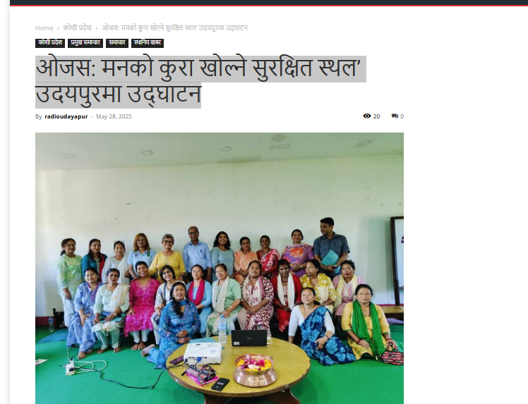 ओजस: मनको कुरा खोल्ने सुरक्षित स्थल’ उदयपुरमा उद्घाटन जेठ १४, २०८२ बुधबार । अन्तर्राष्ट्रिय महिला स्वास्थ्य अधिकार दिवस (मे २८) को अवसरमा उदयपुरको त्रियुगा नगरपालिका–९, राजाबासस्थित महिला पुनस्थापना केन्द्र ओरेकमा ‘ओजसः मनको कुरा खोल्ने सुरक्षित स्थल’ को औपचारिक उद्घाटन गरिएको छ ।मानसिक स्वास्थ्य समस्याको गम्भीरता दिनप्रतिदिन बढ्दै गइरहेको सन्दर्भमा ओरेकद्वारा सञ्चालित यस केन्द्रले महिलाहरू (र इच्छुक […]