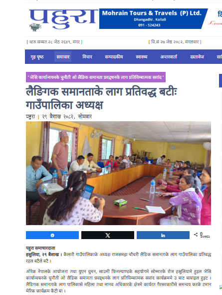 लैङिगक समानताके लाग प्रतिवद्ध बटीः गाउँपालिका अध्यक्ष पहुरा | २९ बैशाख २०८२, सोमबार पहुरा समाचारदाताहसुलिया, २९ बैशाख । कैलारी गाउँपालिकाके अध्यक्ष राजसमझ चौधरी लैङिक समानताके लाग गाउँपालिका प्रतिवद्ध रहल बटैले बटै । ओरेक नेपालके आयोजना तथा युएन वुमन, साउमी फिनल्याण्डके सहयोगमे सोम्मारके रोज हसुलियामे हुइल जेसि कार्यान्वयनके चुनौती ओ लैङिक समानता प्रवद्र्धनके लाग प्रतिविम्बात्मक सवांद कार्यक्रममे […]