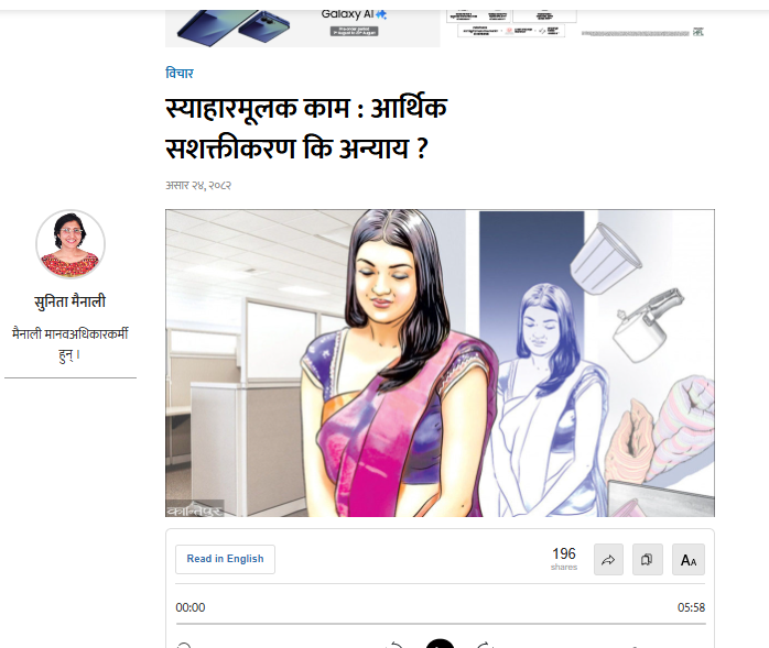 स्याहारमूलक काम : आर्थिक सशक्तीकरण कि अन्याय ? हालका दिनहरूमा स्याहारमूलक कामबारे विभिन्न सार्वजनिक मञ्चमा बहस भइरहेको पाइन्छ । यस्ता छलफलमा प्रायः महिलालाई नै केन्द्रमा राखिन्छ । स्याहार र हेरचाहको काम जो–कोहीले गर्न सक्ने र गर्नुपर्ने मानवीय आवश्यकता हो तर इतिहासदेखि नै यो जिम्मेवारी विशेषतः महिलामाथि थोपरिएको छ । पितृसत्ताको उदयसँगै महिलाको गतिशीलता नियन्त्रण गर्न र उनीहरूलाई घरभित्रै सीमित […]