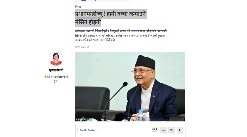 प्रधानमन्त्रीज्यू ! हामी बच्चा जन्माउने मेसिन होइनौं