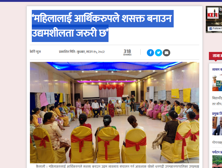 ‘महिलालाई आर्थिकरुपले शसक्त बनाउन उद्यमशीलता जरुरी छ’ कैलाली । महिलाहरुलाई आर्थिकरुपले सशक्त बनाउन उद्यम व्यवसाय संचालन गर्न आवश्यक रहेको धनगढी उपमहानगरपालिका उपप्रमुख कन्दकला रानाले बताईन् । महिला पुनस्र्थापना केन्द्र (ओरेक) नेपालको आयोजनामा महिला कृषक समु्ह र हिंसा प्रभावित महिलालाई उद्यमशिलता तथा सीप विकास तालिम उनले यस्तो बताएका हुन् । पाँच दिने तालिममा धगढी उपमहानगरपालिका, गौरीगंगा […]