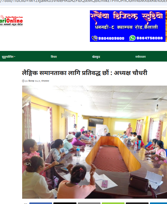 लैङ्गिक समानताका लागि प्रतिवद्ध छौं : अध्यक्ष चौधरी धनगढी, ३० बैशाख । कैलारी गाउँपालिकाका अध्यक्ष राजसमझ चौधरी लैङ्गिक समानताका लागि गाउँपालिका प्रतिवद्ध रहेको बताएका छन् ।ओरेक नेपालको आयोजना तथा युएन वुमन, साउमी फिनल्याण्डको सहयोगमा हसुलियामा भएको जेसि कार्यान्वयनका चुनौती र लैङिक समानता प्रवद्र्धनका लागि प्रतिविम्बात्मक संवाद कार्यक्रममा उनले त्यो कुरा बताएका हुन् । अध्यक्ष चौधरीले […]