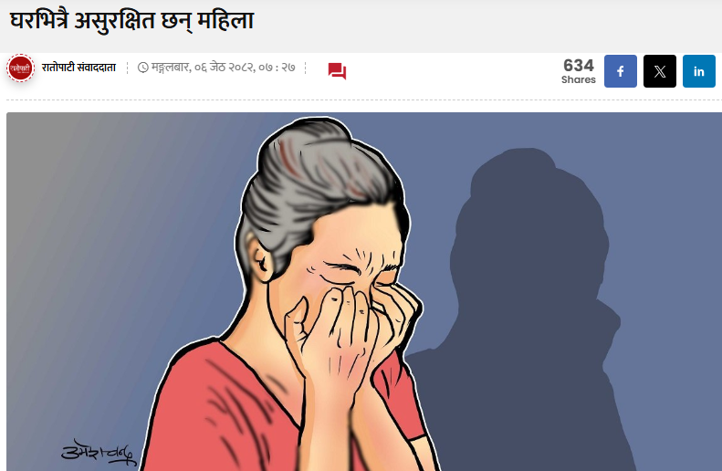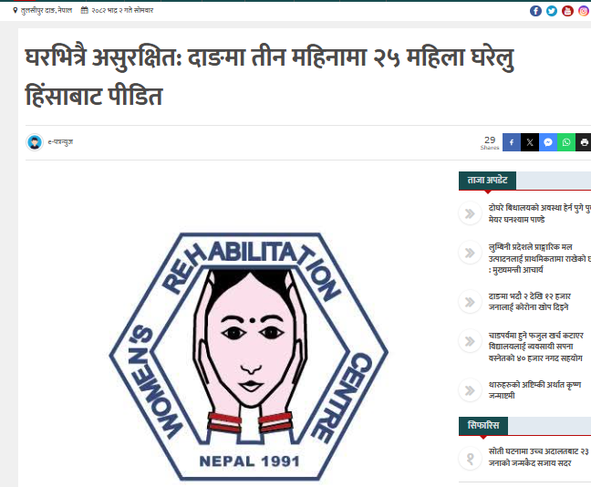 घरभित्रै असुरक्षित: दाङमा तीन महिनामा २५ महिला घरेलु हिंसाबाट पीडित सुरक्षा र माया पाउने ठाँउ मानिने घर नै महिलाका लागि हिंसाको थलो बन्न थालेको छ। दाङमा मात्र पछिल्ला तीन महिनामा ३१ वटा लैंगिक हिंसाका घटना दर्ता भएका छन्, जसमा २५ घटना घरेलु हिंसासँग सम्बन्धित छन्। महिला पुनर्स्थापना केन्द्र (ओरेक) दाङका कार्यक्रम संयोजक कल्पना चौधरीका अनुसार […]