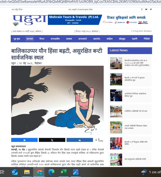 बालिकाउप्पर यौन हिंसा बह्रटी, असुरक्षित बन्टी सार्वजनिक स्थल धनगढी, २२ जेठ । सुदूरपश्चिम प्रदेशके कैलाली जिल्लाके यौन हिंसाके घटना बह्रटी डेखल बा । ओरेक नेपालसे (जनवरी–मार्च २०२५)मे कुल लैङ्गिक हिंसाके ३८ प्रतिशत यौन हिंसा रहल तथ्याङ्कले बालिका ओ महिलाउप्पर हुइना हिंसाके अवस्था गम्भीर रहल डेखल हो । महिला पुनस्र्थापना केन्द्र (ओरेक)के प्रदेश संयोजक सपना थापासे तयार […]