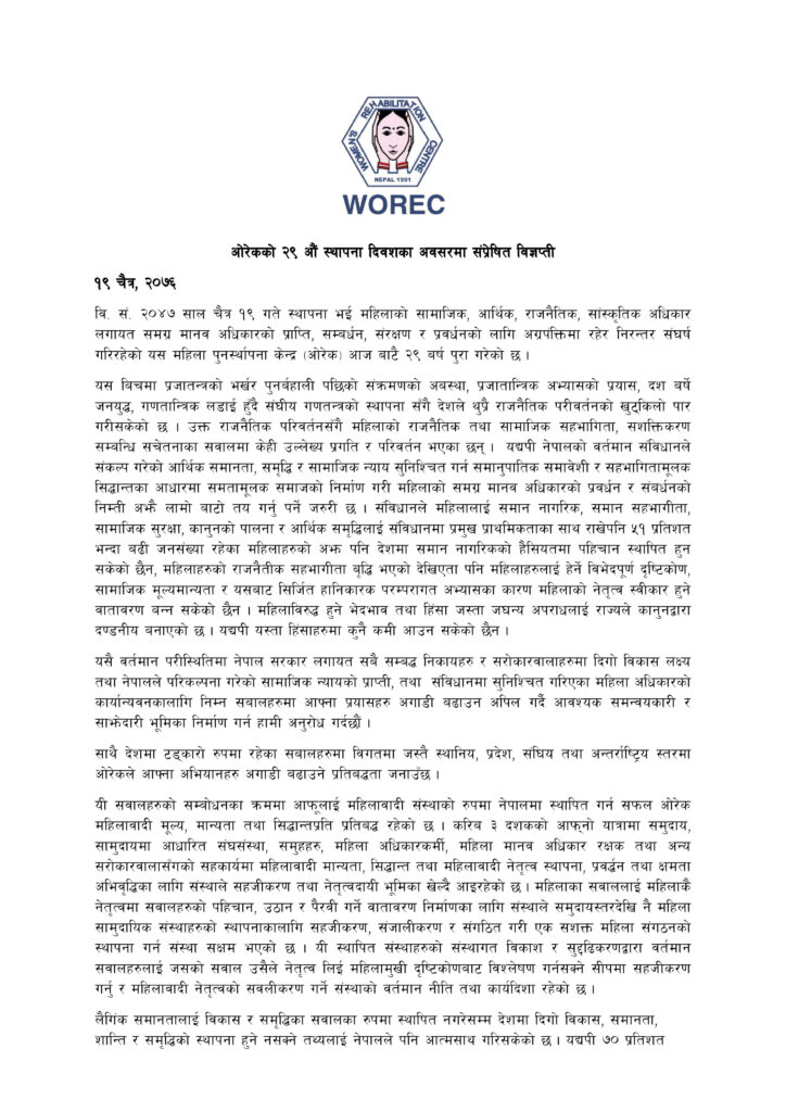 Statement_WOREC_day_Chaitra_29th_WOREC_day.pdf १९ चैत्र, २०७६वि. सं. २०४७ साल चैत्र १९ गते स्थापना भई महिलाको सामाजिक, आर्थिक, राजनैतिक, सांस्कृतिक अधिकार लगायत समग्र मानव अधिकारको प्राप्ति, सम्बर्धन, संरक्षण र प्रवर्धनको लागि अग्रपंक्तिमा रहेर निरन्तर संघर्ष गरिरहेको यस महिला पुनस्र्थापना केन्द्र (ओरेक) आज बाटै २९ बर्ष पुरा गरेको छ । यस बिचमा प्रजातन्त्रको भर्खर पुनर्बहाली पछिको संक्रमणको अबस्था, प्रजातान्त्रिक अभ्यासको […]