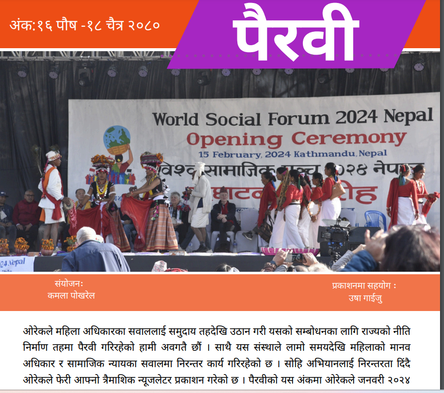 ओरेकले महिला अधिकारका सवाललाई समुदाय तहदेखि उठान गरी यसको सम्बोधनका लागि राज्यको नीति निर्माण तहमा पैरवी गरिरहेको हामी अवगतै छौं । साथै यस संस्थाले लामो समयदेखि महिलाको मानव अधिकार र सामाजिक न्यायका सवालमा निरन्तर कार्य गरिरहेको छ । सोहि अभियानलाई निरन्तरता दिंदै ओरेकले फेरी आफ्नो त्रैमाशिक न्यूजलेटर प्रकाशन गरेको छ । पैरवीको यस अंकमा ओरेकले […]