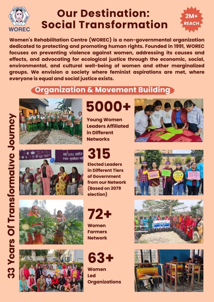आफ्नो स्थापनाकालदेखि नै महिला अधिकारका सवाललाई समुदाय तहदेखि उठान गरी यसको सम्बोधनका लागि राज्यको नीति निर्माण तहमा पैरवी गरि रहेको यस संस्थाले लामो समयदेखि महिलाको मानव अधिकार र सामाजिक न्यायका सवालमा निरन्तर कार्य गरिरहेको छ । सोहि अभियानलाई निरन्तरता दिंदै यहि २०२३ जनवरी देखि आफ्ना अभियानलाई विषयगत क्षेत्रमा वर्गिकरण गरी विभिन्न स्थानीय, राष्ट्रिय तथा अन्तराष्ट्रिय […]