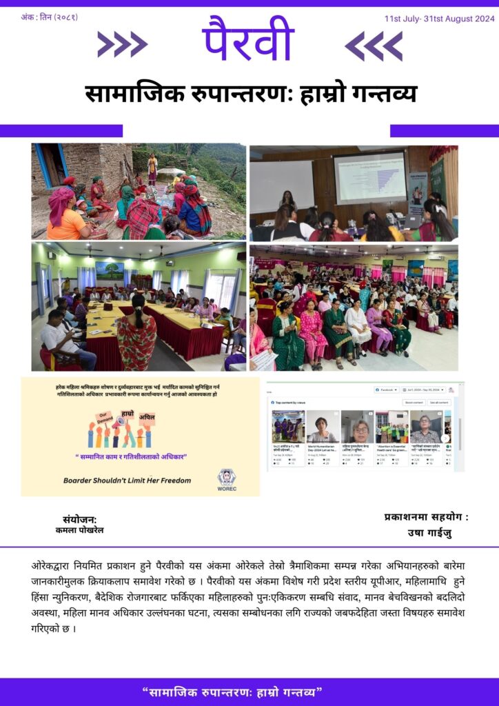 ओरेकद्वारा नियमित प्रकाशन हुने पैरवीको यस अंकमा ओरेकले तेस्रो त्रैमाशिकमा सम्पन्न गरेका अभियानहरुको बारेमा जानकारीमुलक क्रियाकलाप समावेश गरेको छ । पैरवीको यस अंकमा विशेष गरी प्रदेश स्तरीय यूपीआर, महिलामाथि हुने हिंसा न्युनिकरण, बैदेशिक रोजगारबाट फर्किएका महिलाहरुको पुनःएकिकरण सम्बधि संवाद, मानव बेचविखनको बदलिदो अवस्था, महिला मानव अधिकार उल्लंघनका घटना, त्यसका सम्बोधनका लगि राज्यकाे जबफदेहिता जस्ता विषयहरु […]