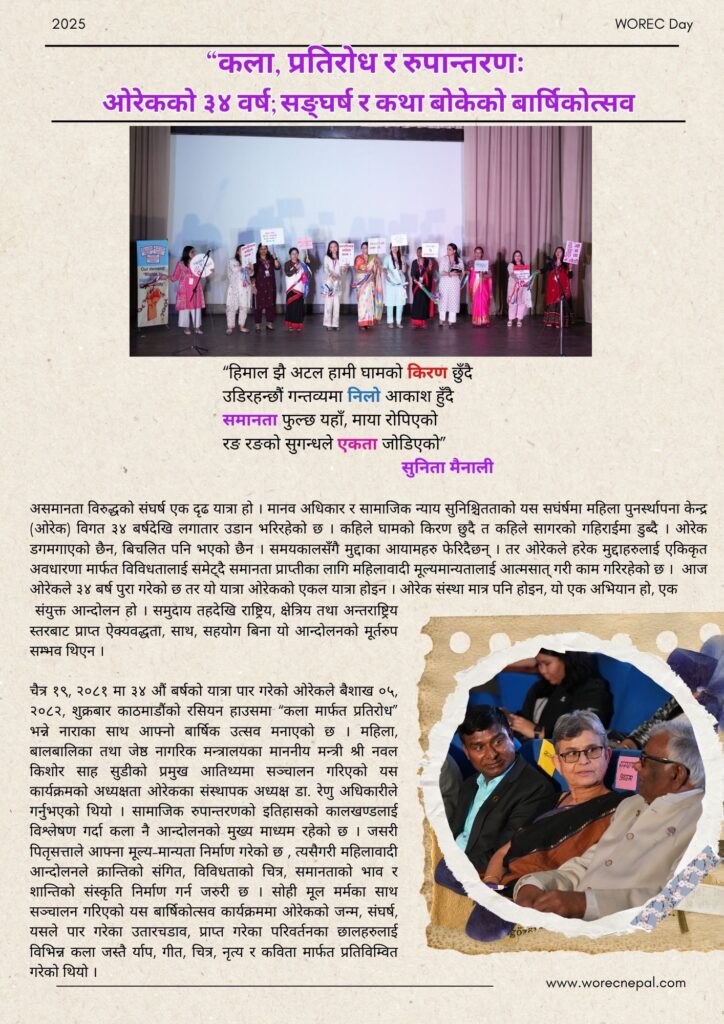 असमानता विरुद्धको संघर्ष एक दृढ यात्रा हो । मानव अधिकार र सामाजिक न्याय सुनिश्चितताको यस सघंर्षमा महिला पुनर्स्थापना केन्द्र (ओरेक) विगत ३४ बर्षदेखि लगातार उडान भरिरहेको छ । कहिले घामको किरण छुदै त कहिले सागरको गहिराईमा डुब्दै । ओरेक डगमगाएको छैन, बिचलित पनि भएको छैन । समयकालसँगै मुद्दाका आयामहरु फेरिदैछन् । तर ओरेकले हरेक मुद्दाहरुलाई […]
