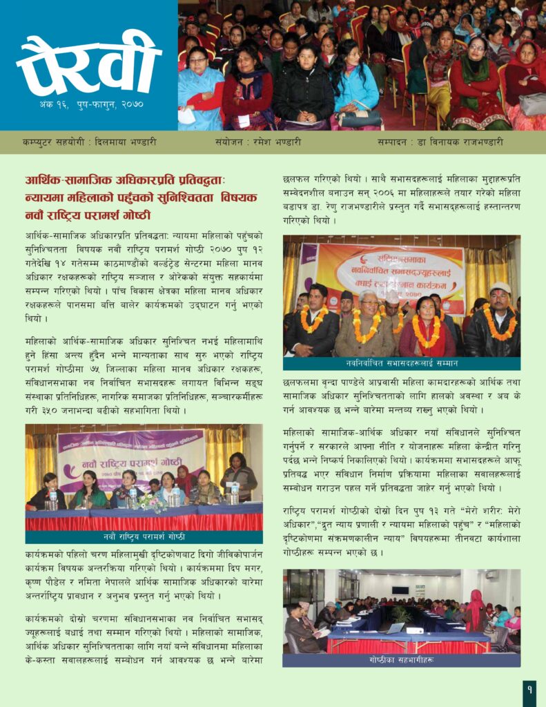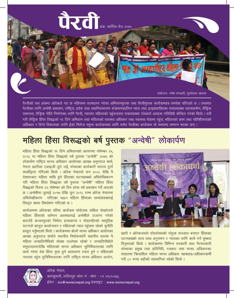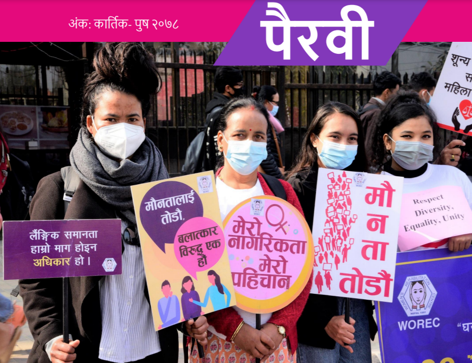 पैरवीको यस अंकमा ओरेकले जनवरीदेखि मार्च २०२१ सम्म सञ्चालन गरेका अभियानमुलक तथा पैरवीमुलक कार्यक्रमहरुको जानकारी समवेश गरिएको छ । यस अवधीमा अन्तर्राष्ट्रिय श्रमिक महिला दिवसको अवसरमा पैरवीमुलक तथा सचेतनामुलक कार्यक्रम, द्वन्द प्रभावित महिलाहरुको न्यायमा पहुँच, श्रमिक महिलाहरुको सवालमा स्थानिय तहको भूमिका, कोभिड १९ प्रतिकार्यको लैंगिक विश्लेषण, महिलावादी नेतृत्व विकासका लागि क्षमता सवलीकरण, महिला तथा बालिकामाथि सार्वजनिकस्थलमा हुने विभेद […]