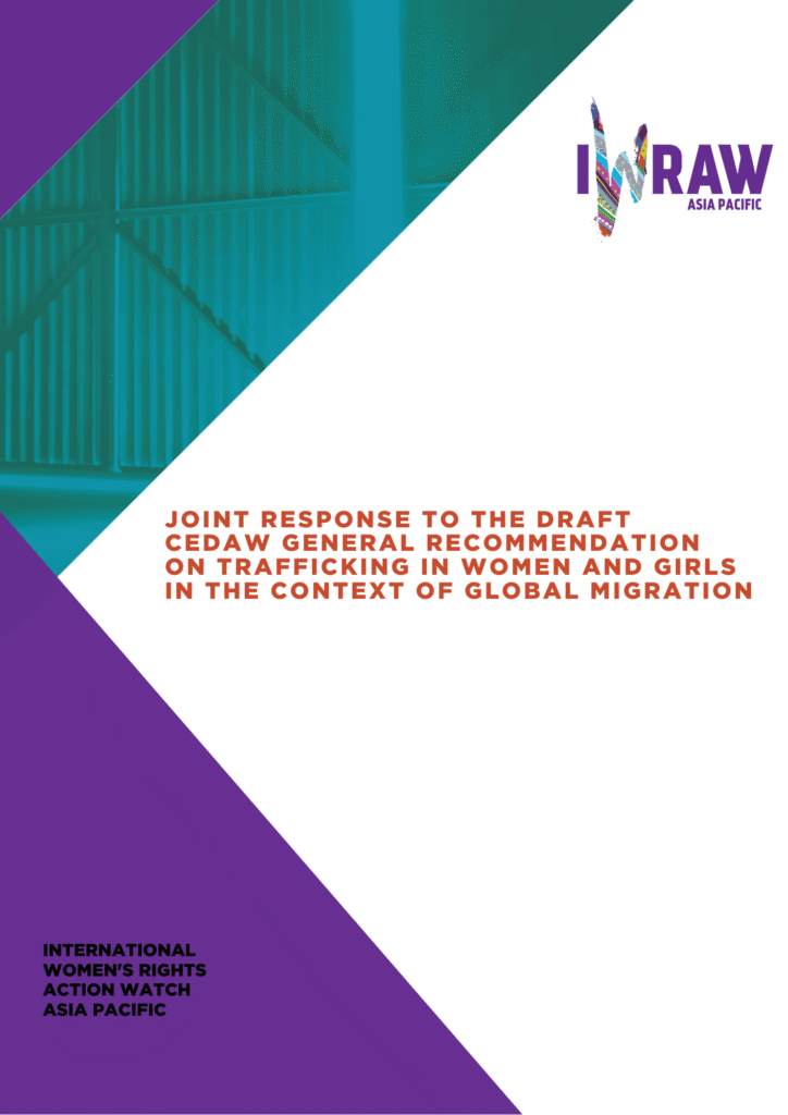 Submitted by 17 individuals and organisations, including IWRAW Asia Pacific, this six-page PDF outlines key concerns on, and requests changes to, the draft General Recommendation which was shared by the CEDAW Committee in March 2020. https://docs.google.com/viewer?embedded=true&url=https%3A%2F%2Fwww.iwraw-ap.org%2Fwp-content%2Fuploads%2F2020%2F05%2FJoint-Response-to-CEDAW-GR-on-Trafficking.pdf